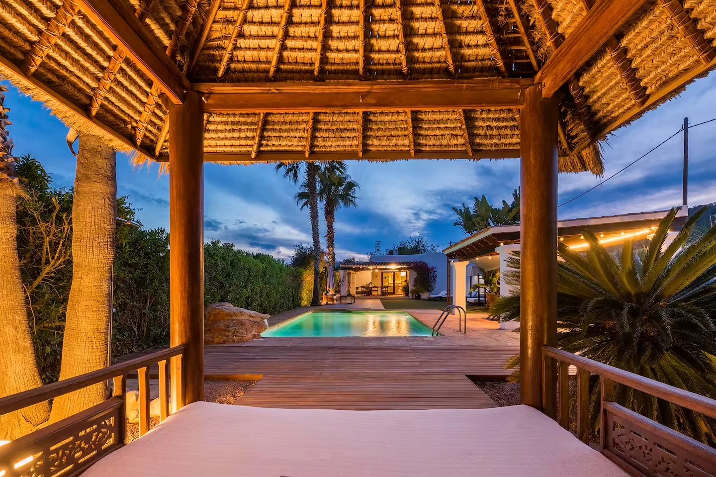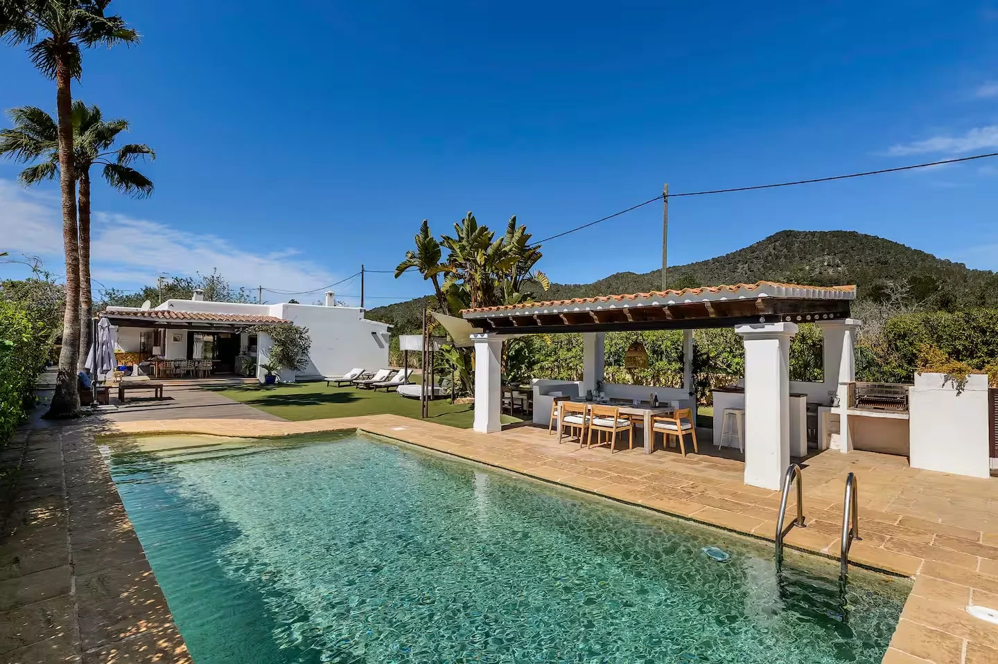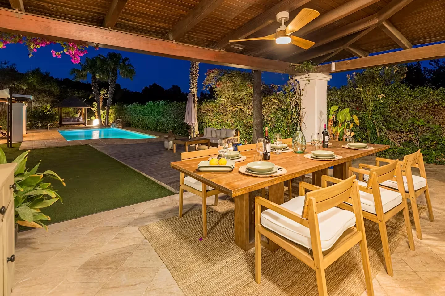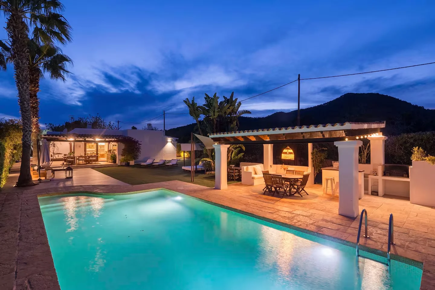 La piscina es el centro de la villa, donde los colores de Ibiza se trasladan al jardín y crean un ambiente único. La zona chill out es especialmente acogedora, perfecta para disfrutar de algunos de los momentos más relajantes de las vacaciones, rodeados de un entorno botánico que invita a la calma y la conexión con la naturaleza.