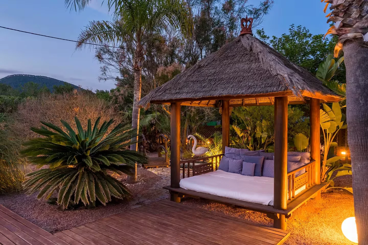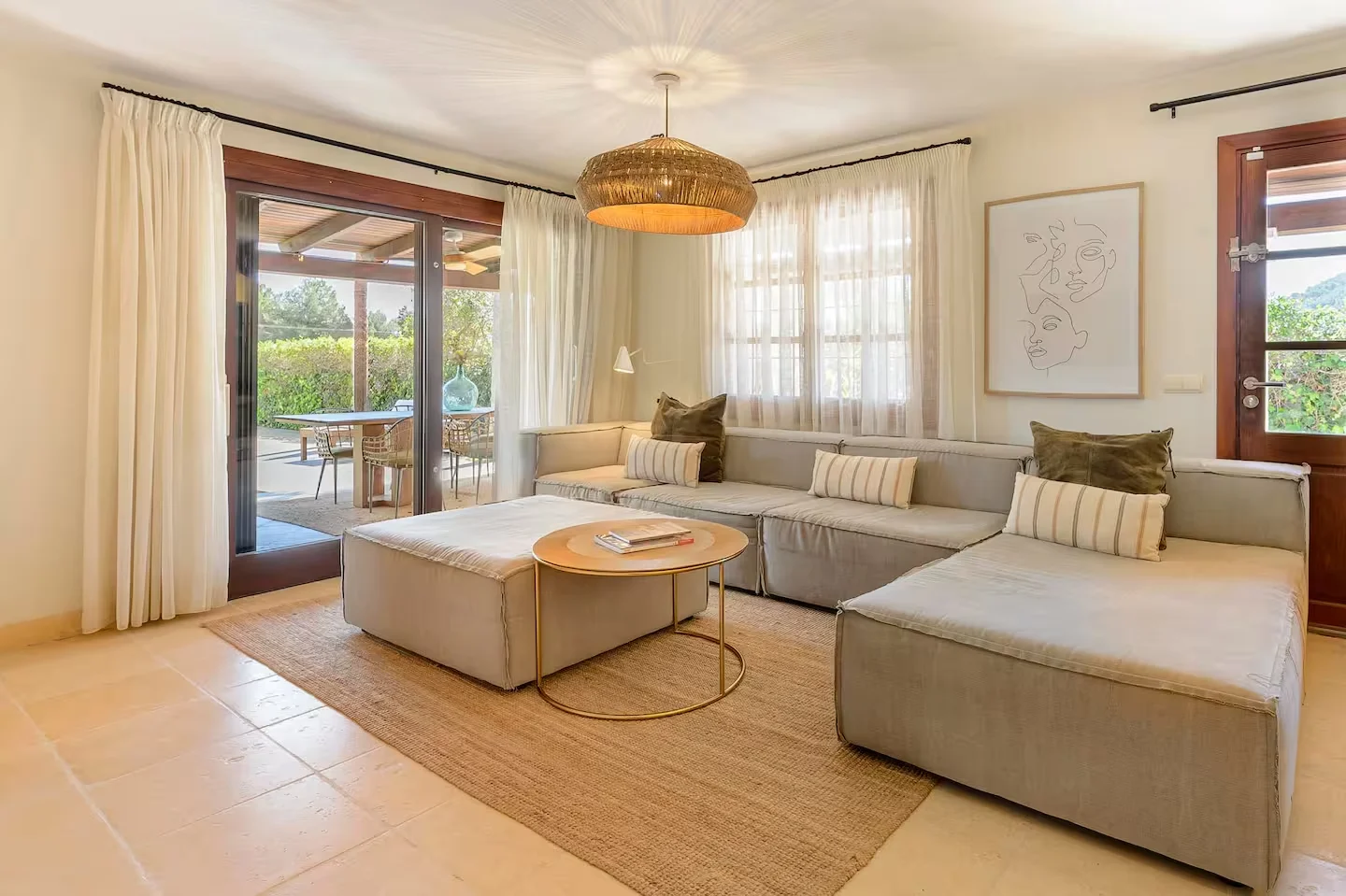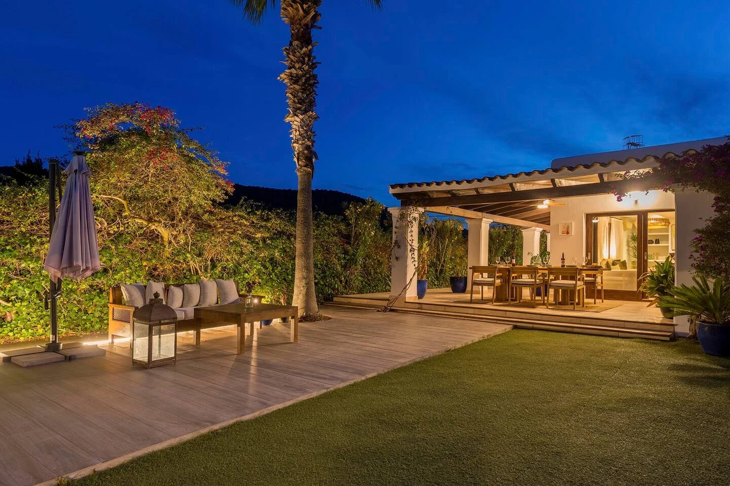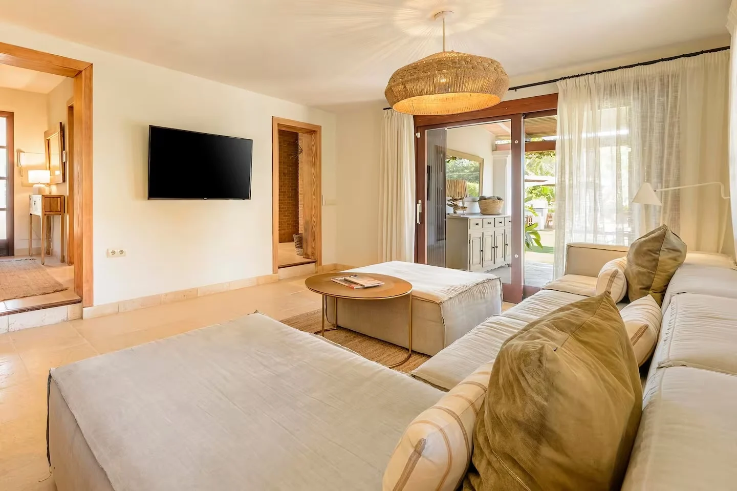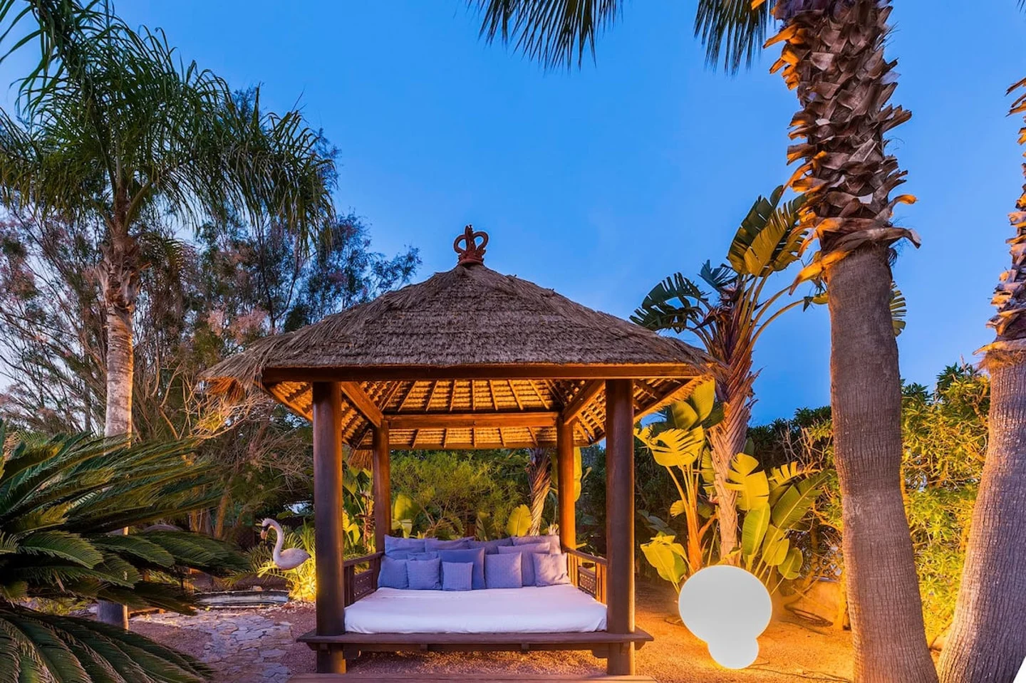 La piscina es el centro de la villa, donde los colores de Ibiza se trasladan al jardín y crean un ambiente único. La zona chill out es especialmente acogedora, perfecta para disfrutar de algunos de los momentos más relajantes de las vacaciones, rodeados de un entorno botánico que invita a la calma y la conexión con la naturaleza.